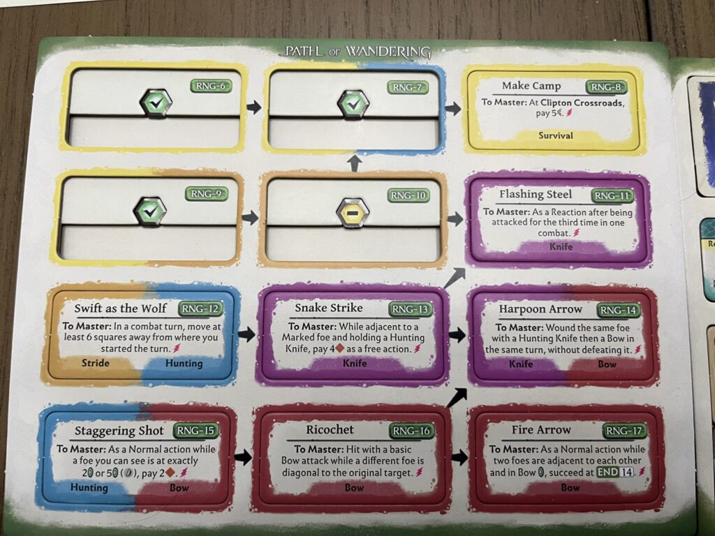 Next, whenever you travel on the world map between hexes, you are required to draw from an exploration deck. One of my favorite parts of this system are the random encounters. Over the course of the game, you’ll be instructed to add cards to the exploration deck, usually as a result of finishing certain quests. Later when you’re exploring, you may run into those characters again as a result of drawing a card from the exploration deck. Overall, I loved this system; however, if I were to nitpick, later in my campaign, I found myself having to double back to certain locations, and in that case, the exploration deck became a bit more tedious. Speaking of, be sure to keep notes as you go to avoid having to revisit certain locations because some cards will require you to find other cards with a certain text in order to complete. This also comes in handy between sessions to remember any plans you had.