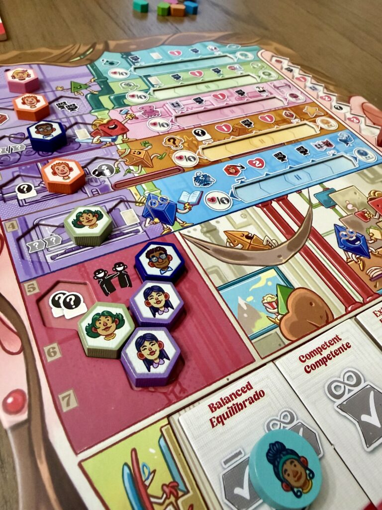 The game’s unique theme is what initially caught my interest. The game offers a compelling and thematic arc where at the beginning of the game, there are a limited number of locations available, and players only have to manage two mood tracks. However, as the game progresses, more locations and mood tracks unlock, introducing more bonuses and more tracks to juggle. I like how this thematically ties to the concept of players aging. In addition, each location impacts up to three mood tracks, which have thematic tie-ins as well. For example, the school increases the player’s learning and popularity, while making them bored. This creates a fun mini game where you have to juggle the five different mood tracks as moving higher up the tracks unlocks ongoing bonuses, while moving the token too far in the opposite direction can cause the player to gain frustration tokens and lose victory points.