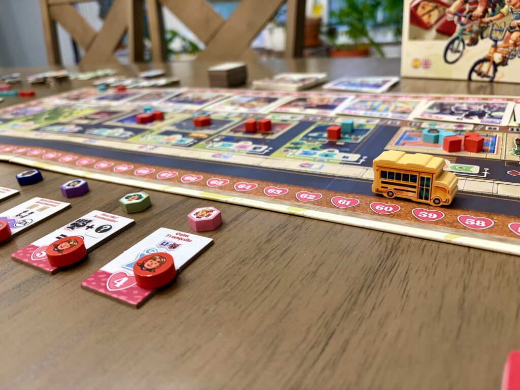 Another interesting mechanism is the game’s bus system. In each round, the bus token stops at every location and every player with a die or presence token at that location gets the bonus on the matching bus stop tile. This could involve gaining friendship with the matching character, which gains victory points and triggers more bonuses, or other bonuses like allowing you to move a mood counter. At the end of each round, the bus tiles shift one space, so it adds another element of decision making when deciding which location to visit. Players can also leave a presence token at a location they visit, thematically representing a gained hobby, allowing the player to gain the bus stop bonus without needing to have a die at that location in future rounds. I found leaving presence to be quite important early in the game to gain a lot of passive bonuses in later rounds.