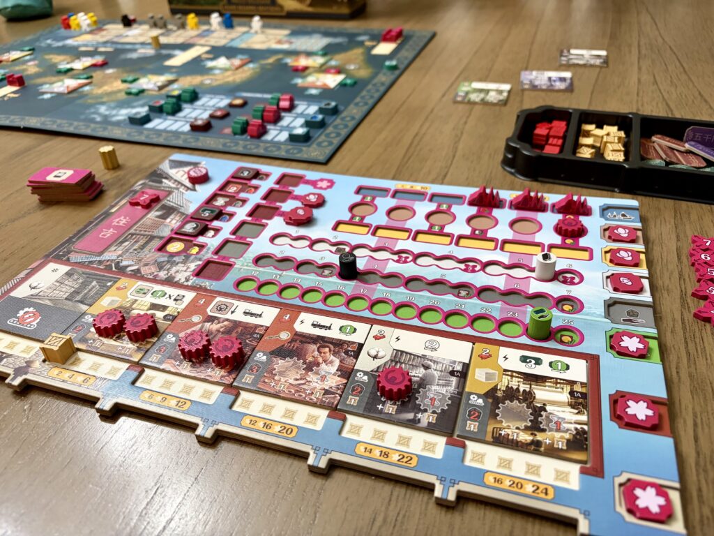 The new edition also includes a solo mode. Overall, it was easy to pilot, but it wouldn’t be my preferred way to play the game. While each player is building out their own zaibatsu, the game has a subtle amount of player interaction. During the game, I can quickly glance over to my opponents’ boards to get a sense of which actions they might perform soon, and if there’s a certain colored worker that I need, I might prioritize that action sooner. In addition, a large number of your points during the game will come from influence scoring, effectively an area control/majority mechanism, which happens at the end of each period. Not only will players be competing in the same markets, but since the round timers are dynamic, sometimes players might want to either speed up or delay those scoring milestones. All of this interesting tension is lost in the solo mode, and while it’s certainly a faster way to play the game, I think I would accept the tradeoff of playing the game multiplayer.