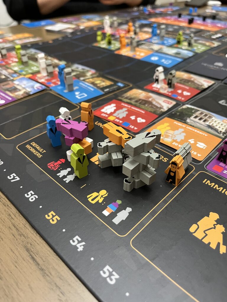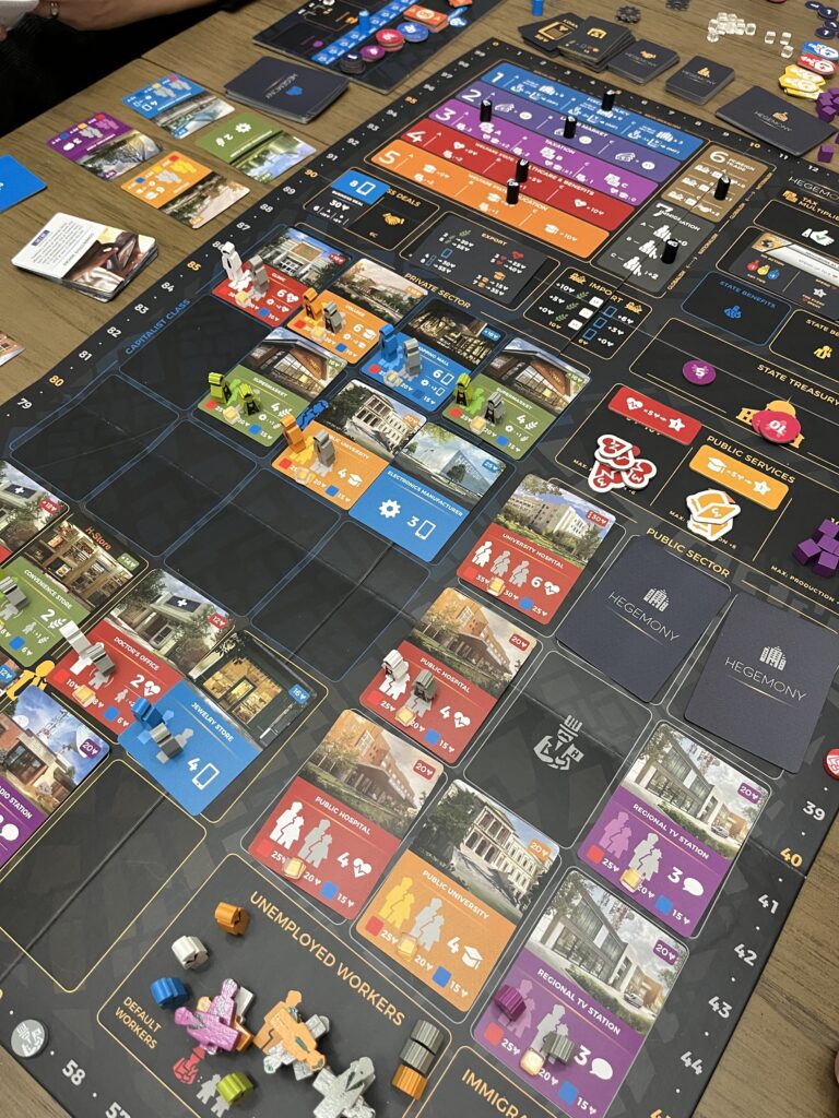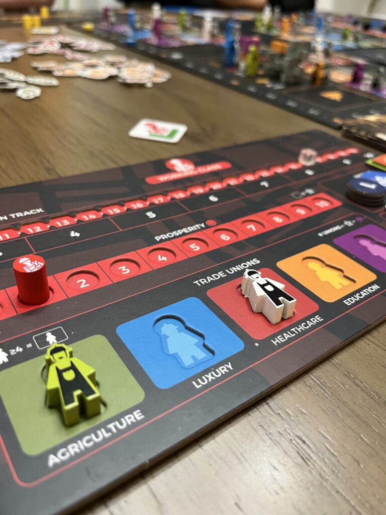 It’s unusual to see a heavy euro game with a political-economic theme, which makes the game that more impressive considering how well the mechanisms are intertwined with real-world academic principles. The Capitalist Class needs workers to work in their companies, so they employ Working and Middle Class workers; however, the Capitalists also have to pay their workers’ wages, which can be adjusted throughout the game; if wages are too low or too high, one of the Classes can call a vote to change the labor laws, which sets the minimum wage. This level of detail in the game’s design makes this not only a highly enjoyable simulation, but is also a great educational resource to learn more about the highly complex, real-life political and economic systems. I can understand that playing a heavy political-economic simulation might not be everyone’s cup of tea, but it’s astonishing how well Hegemony is able to build an enjoyable experience while throwing in an educational angle without feeling too dull or overwhelming.