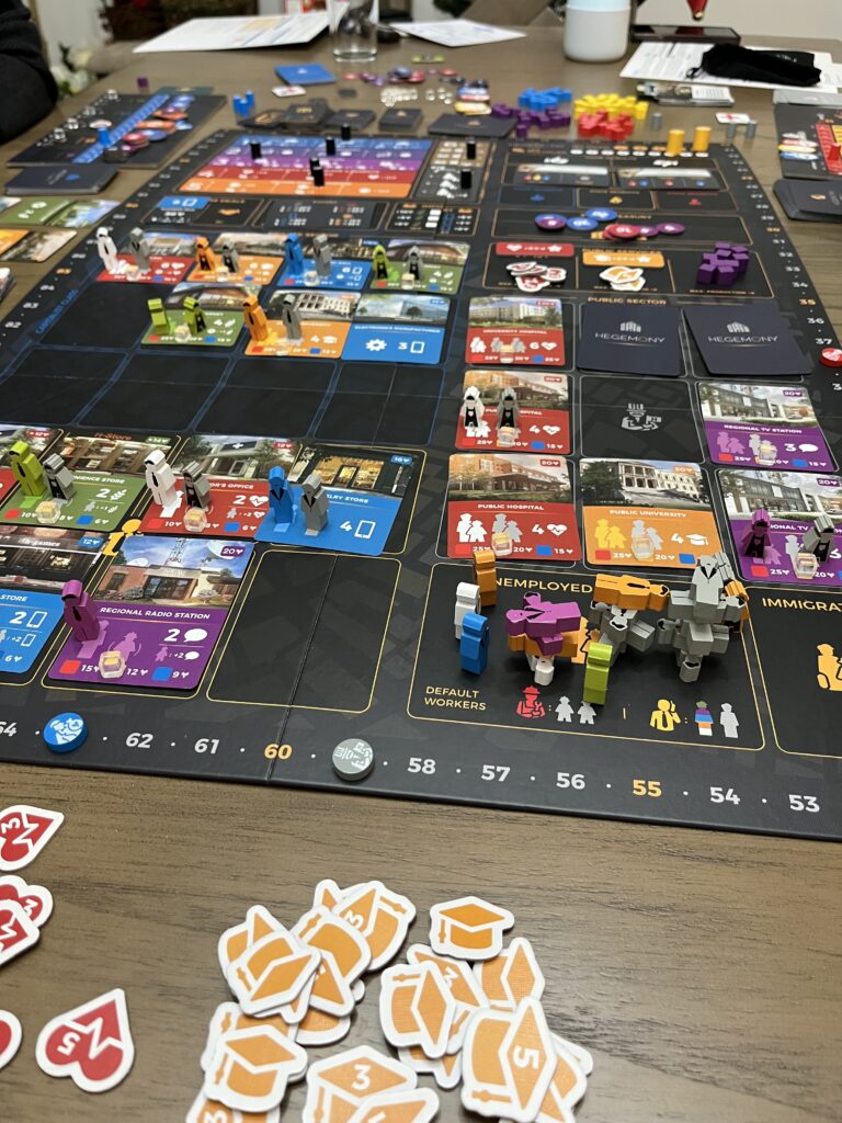 If you’re looking for a game with plenty of player interaction, then I’m happy to report that Hegemony has it in spades. I already mentioned how players interact through companies and wages, but almost every action you take in this game impacts the other players at the table. One of the major ways this plays out is through seven policies, such as the size of the Public Sector, Labor Market, taxes, and government benefits. Each of the three classes has preferences on the level of each policy; however, changing policies usually requires classes to work together to vote on a certain outcome. For example, the Working and Capitalist Classes might work together to push for lower taxes, in exchange for the Capitalists supporting the Working Class to expand the Public Sector. There’s a lot of room for negotiation which makes each game feel unique, and as a player, allowing the flexibility to adjust your strategy based on what other players are doing.