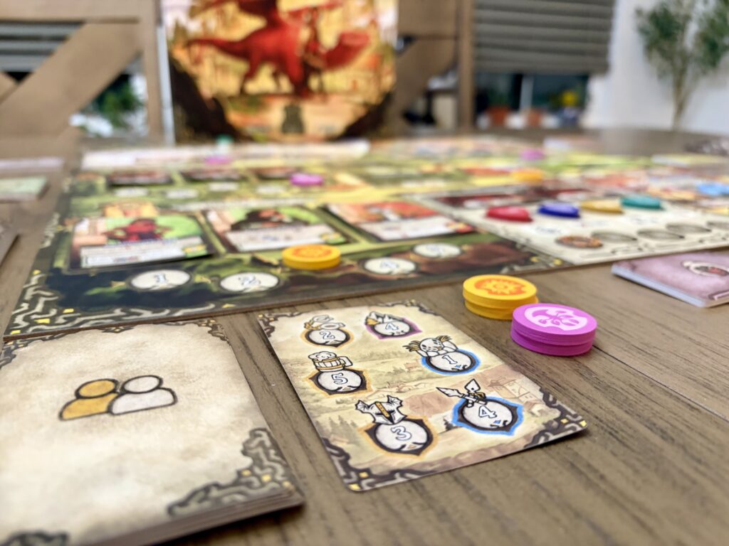 As I mentioned in the intro, Emberheart is about as close to a How to Train Your Dragon-themed game as it gets (without the official license). You act as one of the King’s champions who’s tasked with rescuing and protecting dragons and recruiting heroes. The game takes place over five rounds with each containing two main phases. The first involves placing workers to the game’s six main locations which contain cards, such as dragons or heroes that you add to your personal tableau. In addition, each of the six main locations have five different spaces, which correspond to the number of hirelings you send to that location. In the second phase of each round, players take cards from each of the locations. However, the more hirelings you send to that location, the earlier you’ll get to choose your reward.